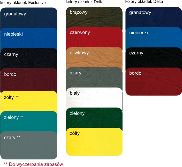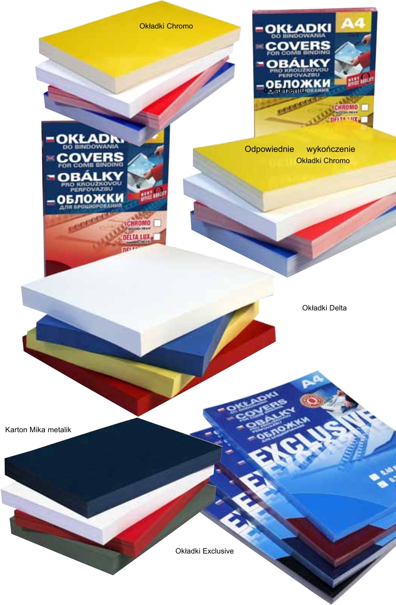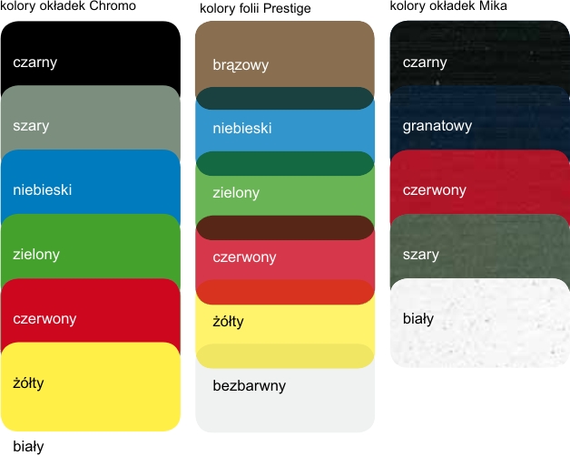 Prestige - kolorowe przód: * krystalicznie przejrzysta folia 150 mic. tył: * skóropodobny karton Delta 225 g/m2, * w kolorach do wyboru: czerwony, zielony, niebieski, szary. * Szerokość grzbietu okładki do 18 mm. * Format A4. |