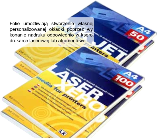 Termookładki * gotowe okładki do termobindowania * specjalny pasek kleju umieszczony w grzbiecie * szerokość grzbietu okładki 1,5 - 50 mm * format A4 |