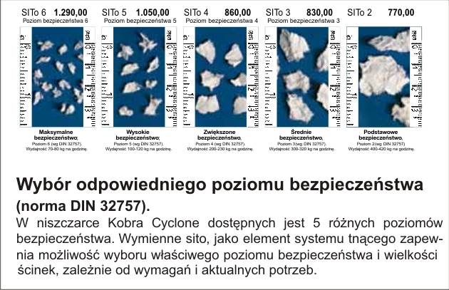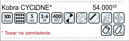 obudowa zapewniają cichą pracę. Kobra Cyclone może osiągnąć imponującą wydajność cięcia 420 kg papieru na godzinę bez wymogu oliwienia noży tnących i innych czynności