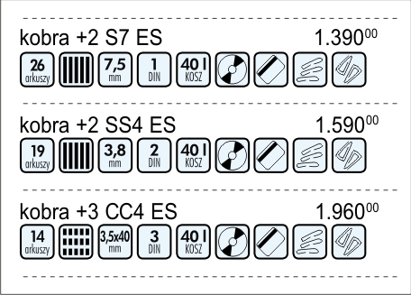 Kobra +2/+3 Niszczarki przeznaczone do średniej wielkości biur i urzędów. Dzięki specjalnej pokrywie, dają gwarancję bezpiecznego użytkowania. * szerokość wejścia 230 mm * jednorazowe niszczenie do 26 arkuszy papieru (+2 S7) * poziom bezpieczeństwa 1-3 DIN * 20 lat gwarancji na noże tnące Unikalne cechy serii +2/+3: * System Throw and Shred - możliwość niszczenia zgniecionych kartek papieru (Kobra +3) [1] [4] * dwa osobne zestawy noży tnących do niszczenia papieru oraz płyt CD i kart plastikowych [2] [3] * sensory automatycznie wstrzymujące pracę urządzenia, gdy pokrywa niszczarki zostanie podniesiona * System Energy Smart – oszczędność energii dzięki zerowemu poborowi mocy w funkcji stand-by * cichy napęd łańcuchowy * trwałe noże odporne na zszywki i spinacze * automatyczny start/stop * zabezpieczenie silnika przed przegrzaniem * silnik przystosowany do pracy ciągłej, dzięki specjalnemu systemowi chłodzenia * automatyczne odcięcie zasilania w przypadku zaklinowania papieru lub wyjęcia pojemnika na ścinki * przezroczyste okno w obudowie pozwalające na kontrolę poziomu napełnienia kosza * oddzielna szczelina do bezpiecznego niszczenia płyt CD * wyjmowany, łatwy do oczyszczenia, zintegrowany pojemnik na ścinki * osobny pojemnik na ścinki papieru oraz płyty CD i karty plastikowe * pojemność kosza 40 l Tabela parametrów technicznych |